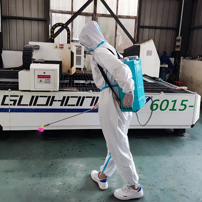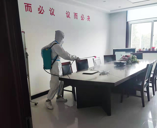 為確保公司各個部門在疫情期間的工作安全,防止疫情傳播,做好消毒防護工作,全公司進行了消毒消殺,消毒中為了不傷害員工身體健康,組織員工撤離現(xiàn)場,消毒人員佩戴口罩、乳膠手套、身穿防護服進行作業(yè)。