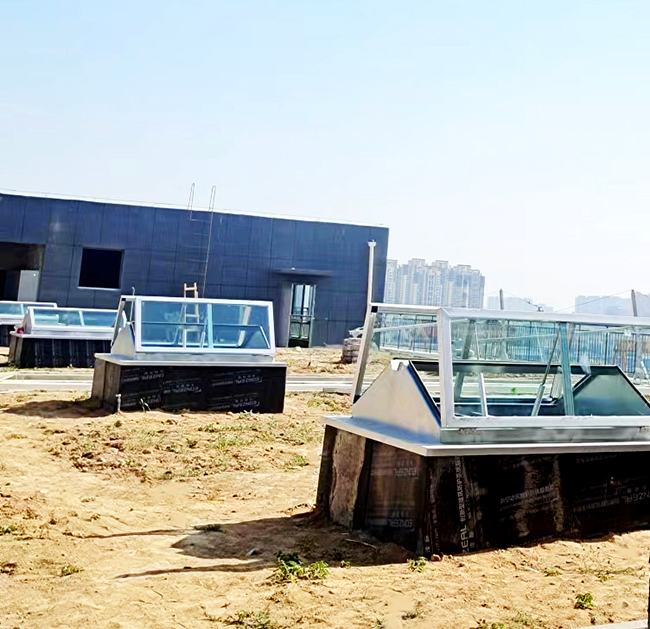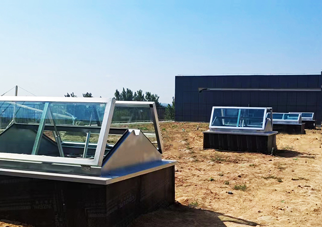 天窗外觀為三角形,天窗頂部可采用采光板或玻璃,有效增加室內采光,且防水性好。開啟電機設計成24V安全電壓,可連接消防聯(lián)動控制系統(tǒng)及風、雨、煙感應器。***開啟角度為60°。