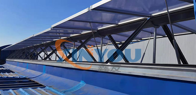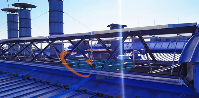 鑫友承接中車唐山8列動(dòng)車組涂裝廠房電動(dòng)采光排煙天窗的設(shè)備供應(yīng)及安裝工程,天窗選擇鋁合金電動(dòng)三角形采光排煙天窗,配置螺桿式開(kāi)窗機(jī),消防聯(lián)動(dòng)控制箱。