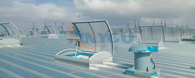 圓拱形的設(shè)計(jì),外觀美觀大氣,能更好的防水,同時(shí)有效減少風(fēng)壓阻力,天窗頂部為采光板,有效增加室內(nèi)亮度,開(kāi)啟電機(jī)設(shè)計(jì)成24V電壓,可連接消防聯(lián)動(dòng)控制系統(tǒng)及風(fēng)、雨、煙感應(yīng)器。***開(kāi)啟角度為45°。