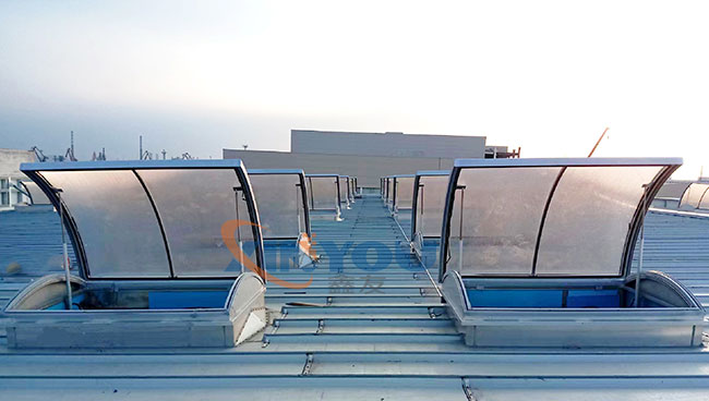 圓拱形的設(shè)計(jì),外觀優(yōu)美、通風(fēng)排煙兼顧自然采光,可實(shí)現(xiàn)消防聯(lián)動控制,開啟角度一般為30度到45度***開啟角度為90°。 夏季有利于排水,冬季不積雪。采用單開或?qū)﹂_形式。天窗啟閉按群組控制,每組天窗數(shù)根據(jù)天窗數(shù)量及控制距離決定。